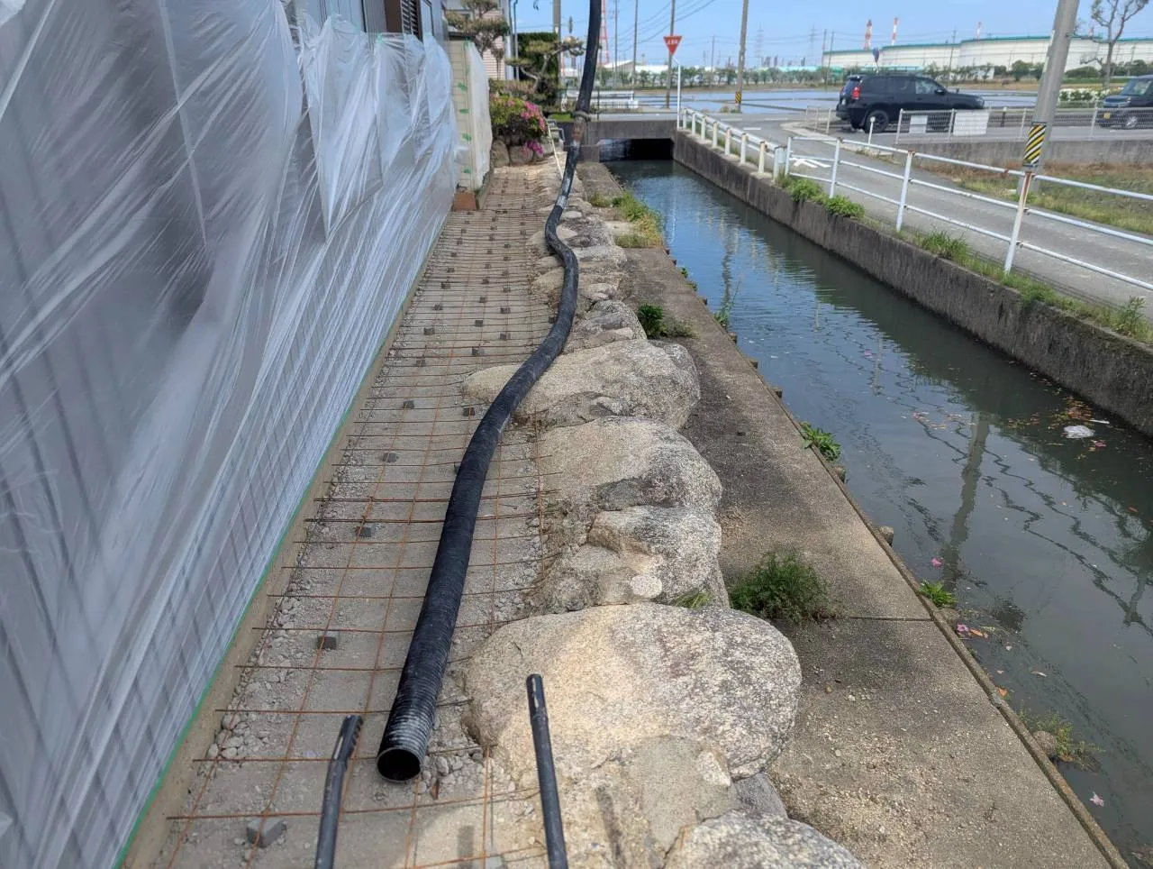 施工前は、砕石を引き詰めた上にワイヤーメッシュを配置し、強度を確保するための下地作りを丁寧に行いました。